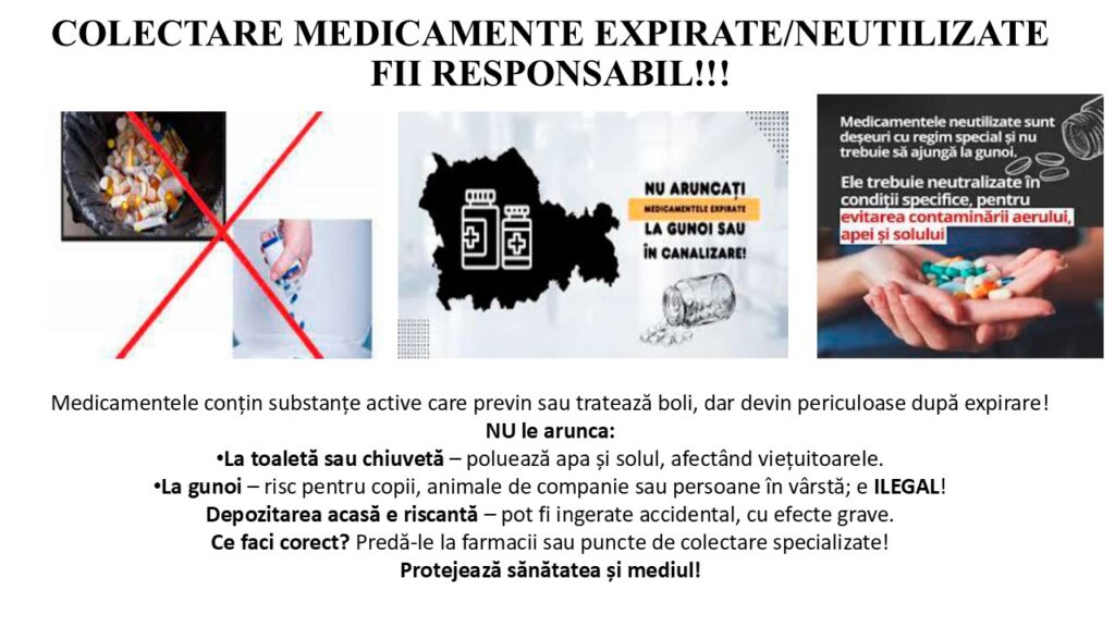 Prin predarea medicamentelor expirate într-un mod responsabil, contribuiți la protejarea mediului și la prevenirea riscurilor pentru comunitate.